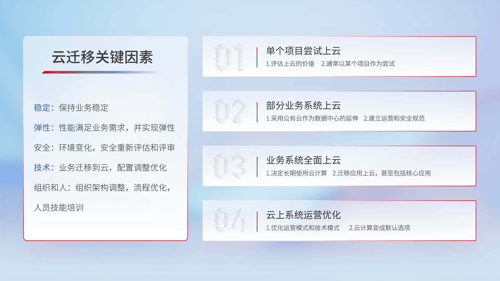 结合实际业务,,从规划设计、、、云平台选型、、云原生改造、、数据迁移、、、、集成交付,,,迁移全过程为客户识别最佳上云路径,,,做好风险识别管理,,,设计网络架构、、、身份权限、、、安全审计合规、、、操作审计、、日志审计、、、监控告警策略、、、、多站点容灾设计等,,对云上基础设施进行整体规划,,,提升IT治理水平,,,,以满足弹性、、、、高可用、、、、高性能的需求。。