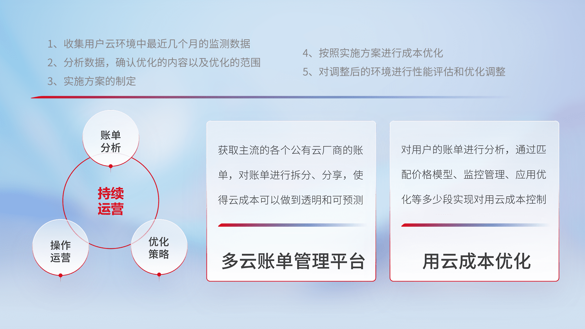 通过多云纳管,,,,以统一的资源数据模型把客户的云资源进行抽象和封装,,,进而实现对多云资源的统一操作,,,保障云资源管理的可靠性、、、、稳定性与可用性。。量身定制化运维内容,,,,配置、、开发运维、、、、补丁管理、、、、备份、、监控、、认证和访问管理、、、、审计和日常巡检等,,保障在用云过程中的可靠度,,,,稳定度以及高可用率。。